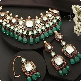 Ameira Kundan Polki Necklace Set with Mint & Ruby Accents (with Earrings & Maang Tikka)