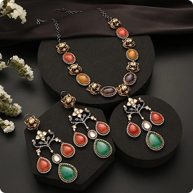 Rajvansh Navratan Multi Polki Necklace with Jhumka Earrings (Antique Gold Finish)