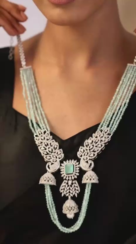 Elina Necklace Set – Mint Green Beaded Long Necklace with CZ Jhumka Earrings