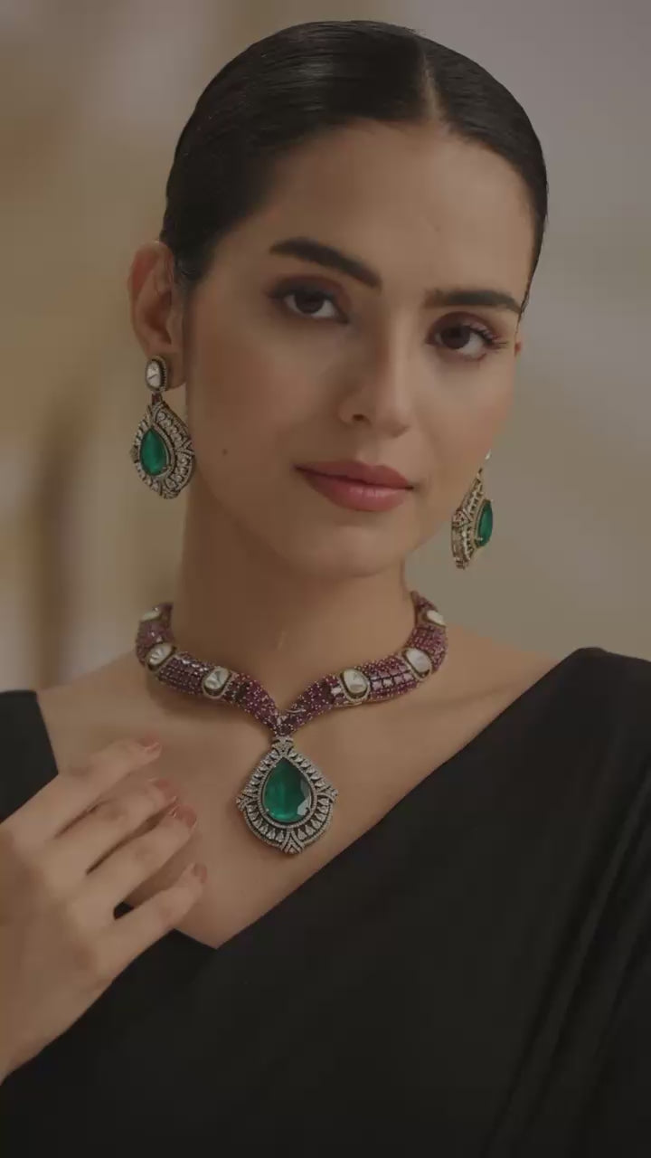 Model wearing Kriti Mint kundan choker with mint doublet stones and matching earrings in Victorian finishVideo of mint Kundan Set in Doublet Stones
