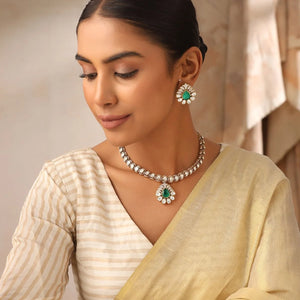 The Aabroo set is a regal masterpiece featuring a choker necklace adorned with uncut polki stones and a striking emerald drop centerpiece. Paired with bold statement earrings, this set embodies grace, heritage, and timeless charm.