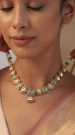 The Amaira Mint Necklace Set is a masterpiece of timeless beauty, featuring uncut polki and mint green stones set in a regal design. Handcrafted with precision, this choker-style necklace is paired with matching earrings, making it perfect for weddings, festive occasions, and special celebrations.