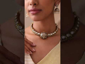 This exquisite antique-finish Moissanite Hasli Set blends traditional artistry with luxurious sparkle. The handcrafted choker features premium moissanite stones, intricate enamel-inspired detailing, and a bold central motif that sits beautifully on the neckline. Paired with statement jhumkas adorned with pearls and moissanite accents, this set is perfect for brides and wedding guests who love timeless Indian elegance.
