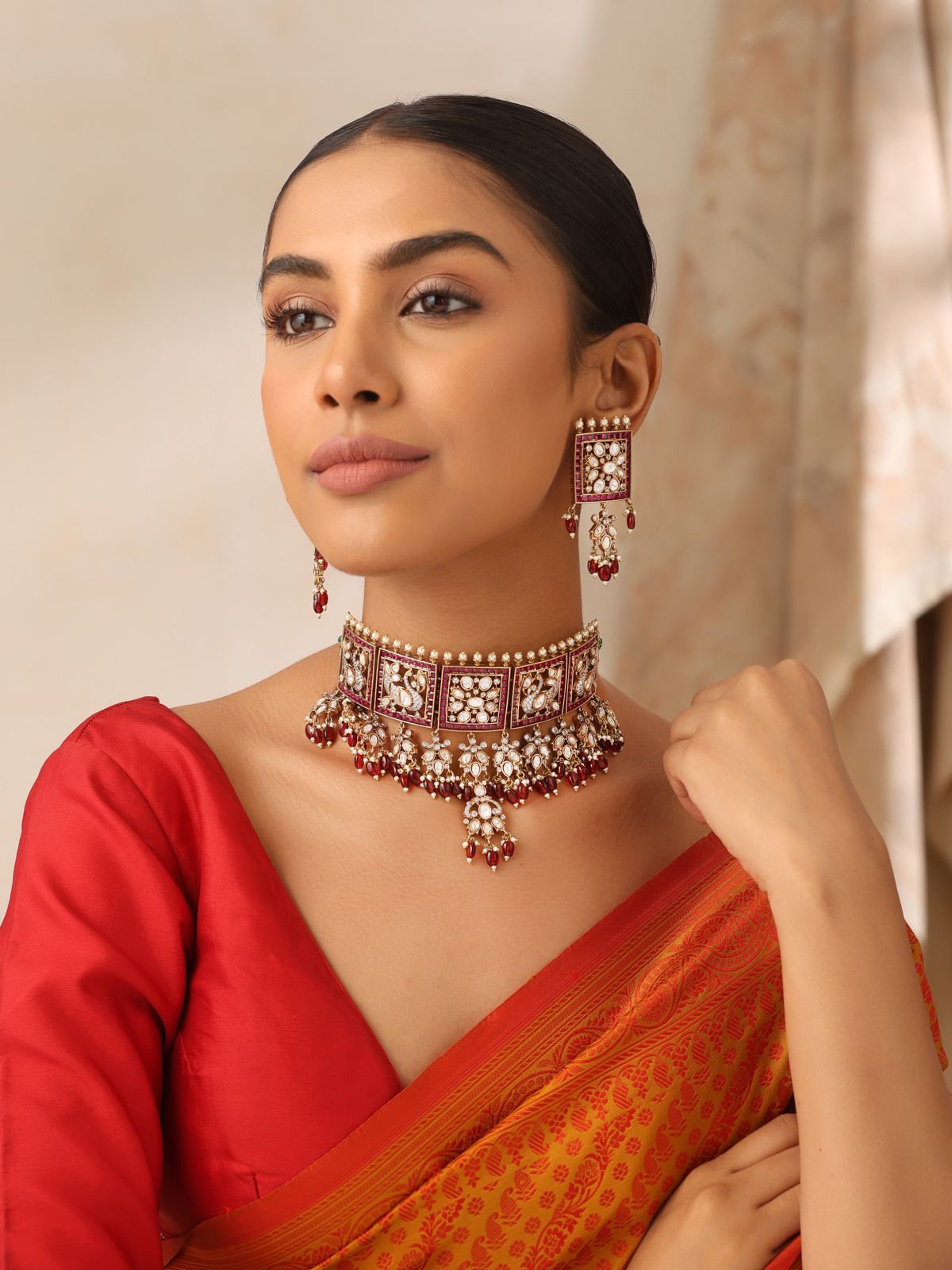 Elevate your festive and bridal look with this handcrafted antique choker set. Featuring square panels adorned with kundan-style stones, intricate detailing, and ruby drop hangings, this set embodies heritage luxury. Paired with bold matching earrings, it is perfect for weddings, receptions, and traditional celebrations.