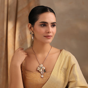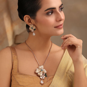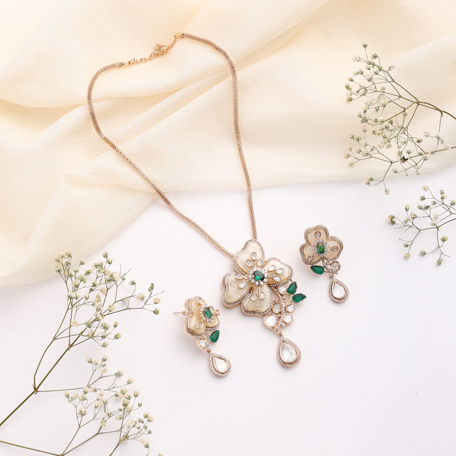 A statement of timeless grace, this handcrafted moissanite and carved emerald pendant set is a perfect fusion of artistry and luxury. Designed with a lustrous mother-of-pearl floral motif, the pendant is adorned with brilliant moissanite stones and emerald accents, symbolizing renewal and elegance. The delicate gold-plated brass mesh chain elevates its regal charm, while the matching earrings echo the same intricate detailing for a complete look.