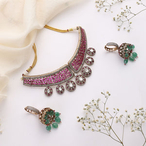 Turn every occasion into a royal celebration with the Devyani Ruby Emerald Choker Set. Crafted with brilliance, this choker features intricate ruby and emerald detailing with uncut polki and CZ embellishments that radiate timeless charm. Paired with statement jhumka-style earrings, it’s a regal treasure designed for weddings, parties, and festive evenings.