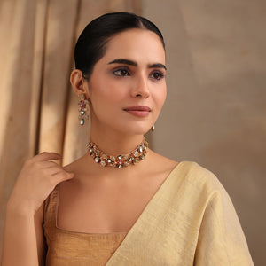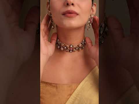 Grace meets grandeur in the Eira Handmade Fusion Choker—a bold yet refined creation crafted with intricate detailing. Ruby-toned pavé work embraces a striking emerald centerpiece, making this piece a perfect blend of tradition and contemporary luxury. Designed to rest gracefully on the neckline, it instantly elevates any bridal or festive ensemble.
