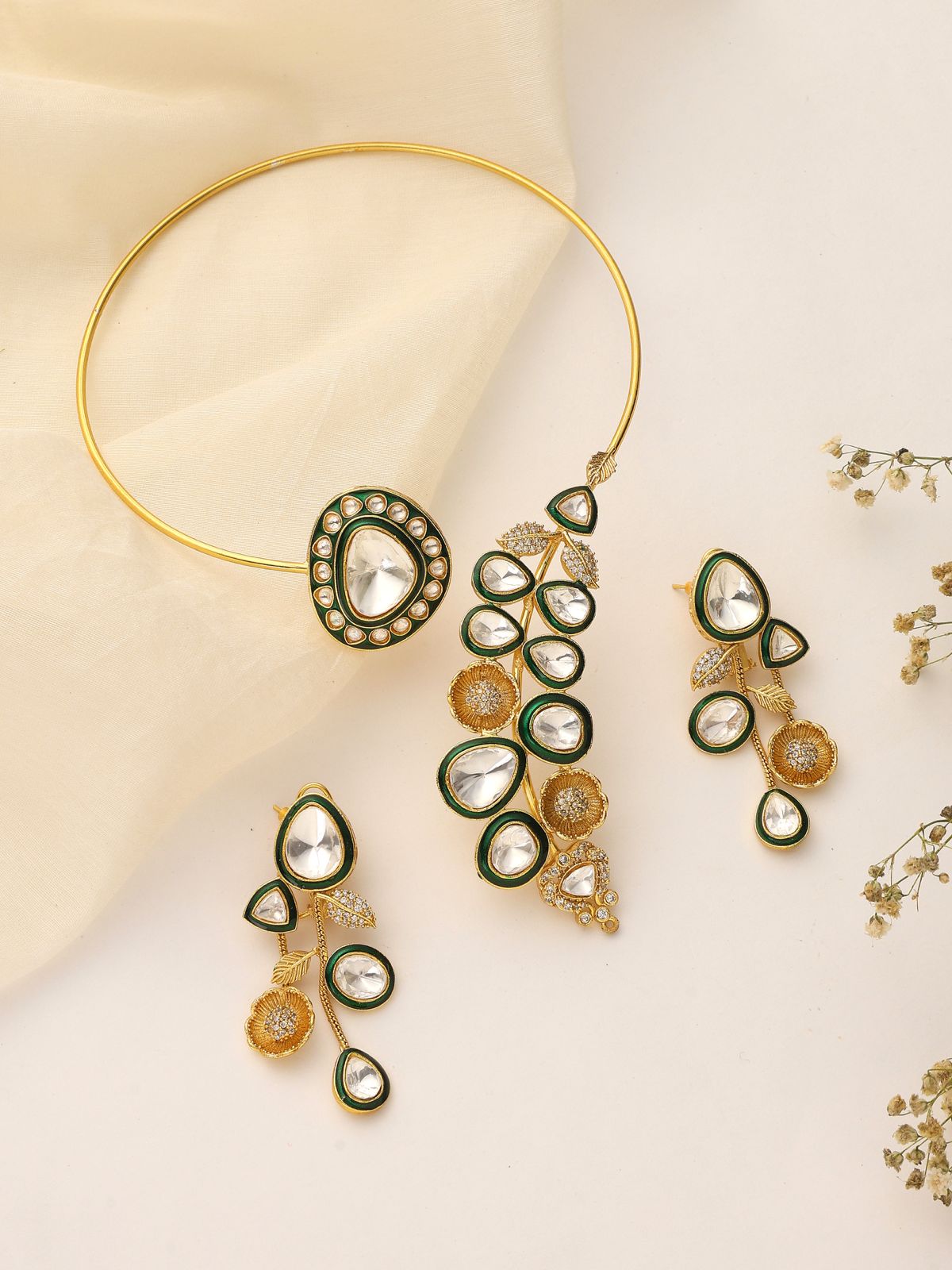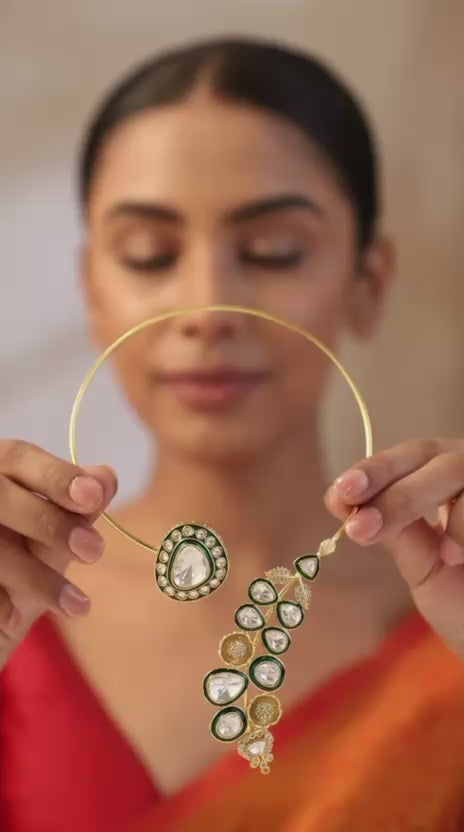Bold meets graceful in Eira, a unique collar-style Kundan necklace set featuring an artistic, asymmetrical layout of hand-set mirror stones and intricate enamel detailing. The rich combination of white, green, and gold makes this set a head-turner for contemporary brides, cocktail events, or modern festive wear.
