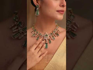 Make an unforgettable statement with the Elara Mint Royale Necklace Set, featuring exquisite mint-green doublet stones framed in antique gold plating. Each stone is delicately handset with sparkling CZ and uncut Polki-style detailing, creating a luxurious blend of heritage charm and modern glamour.