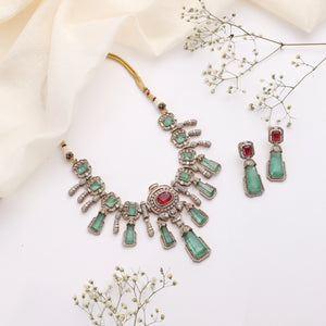 Make an unforgettable statement with the Elara Mint Ruby Doublet Royale Necklace Set, featuring exquisite mint-green and Ruby doublet stones framed in antique gold plating. Each stone is delicately handset with sparkling CZ and uncut Polki-style detailing, creating a luxurious blend of heritage charm and modern glamour.