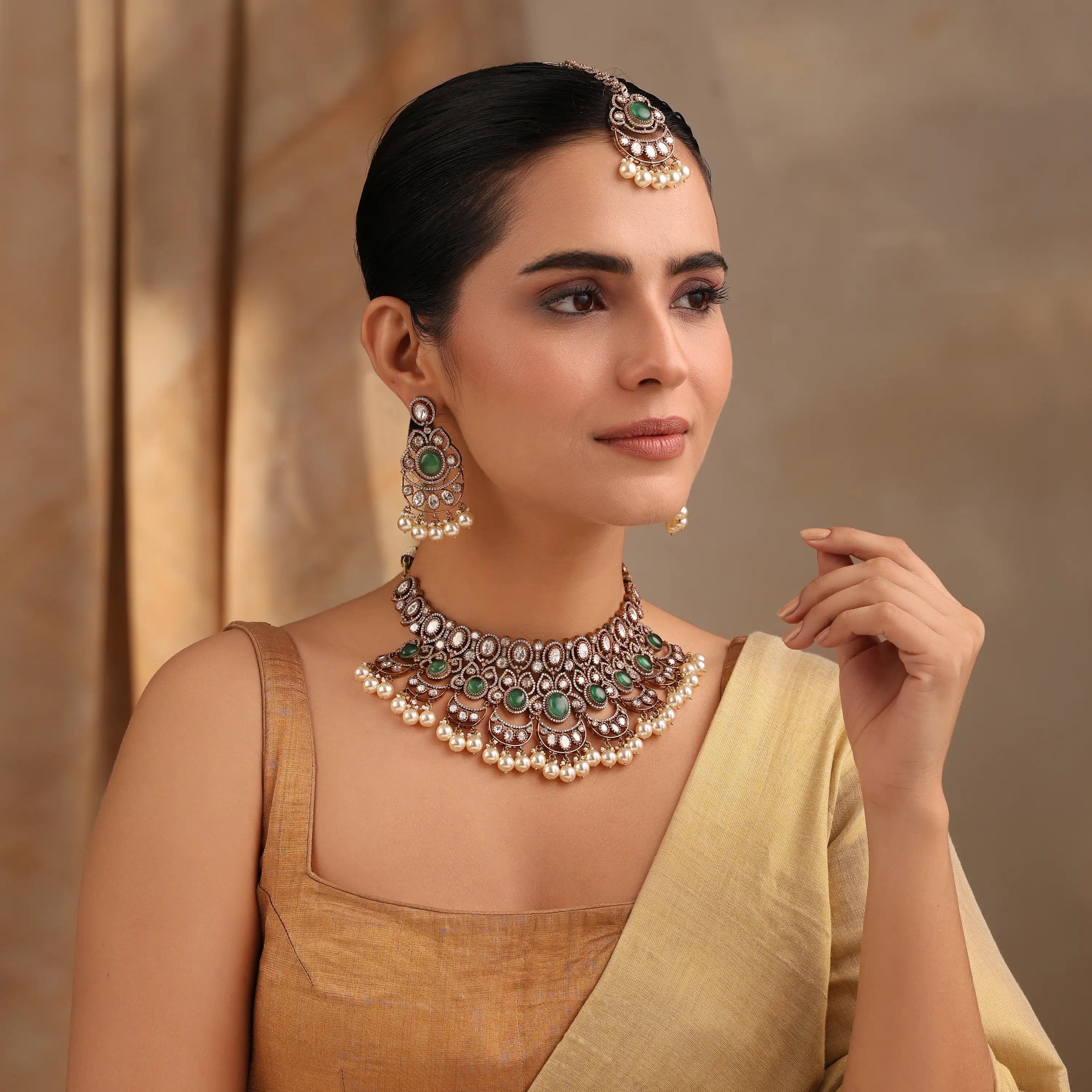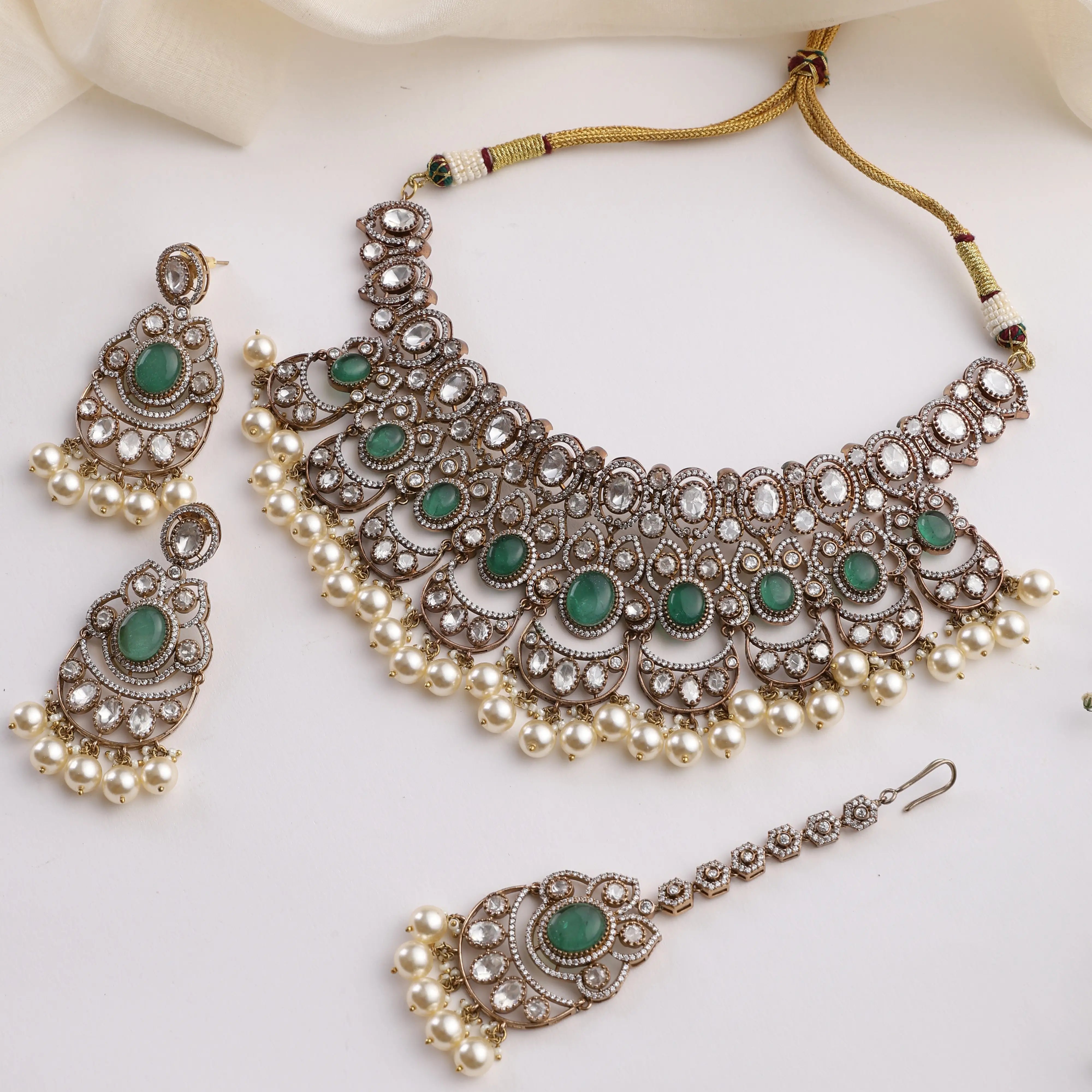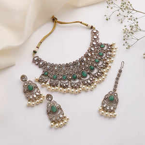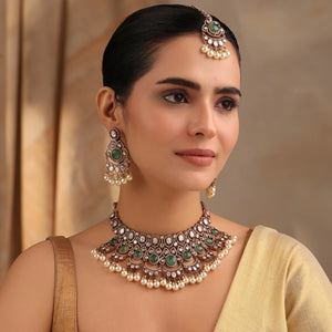 Emerald Kundan Pearl Necklace Set (Necklace + Earrings + Maang Tikka)