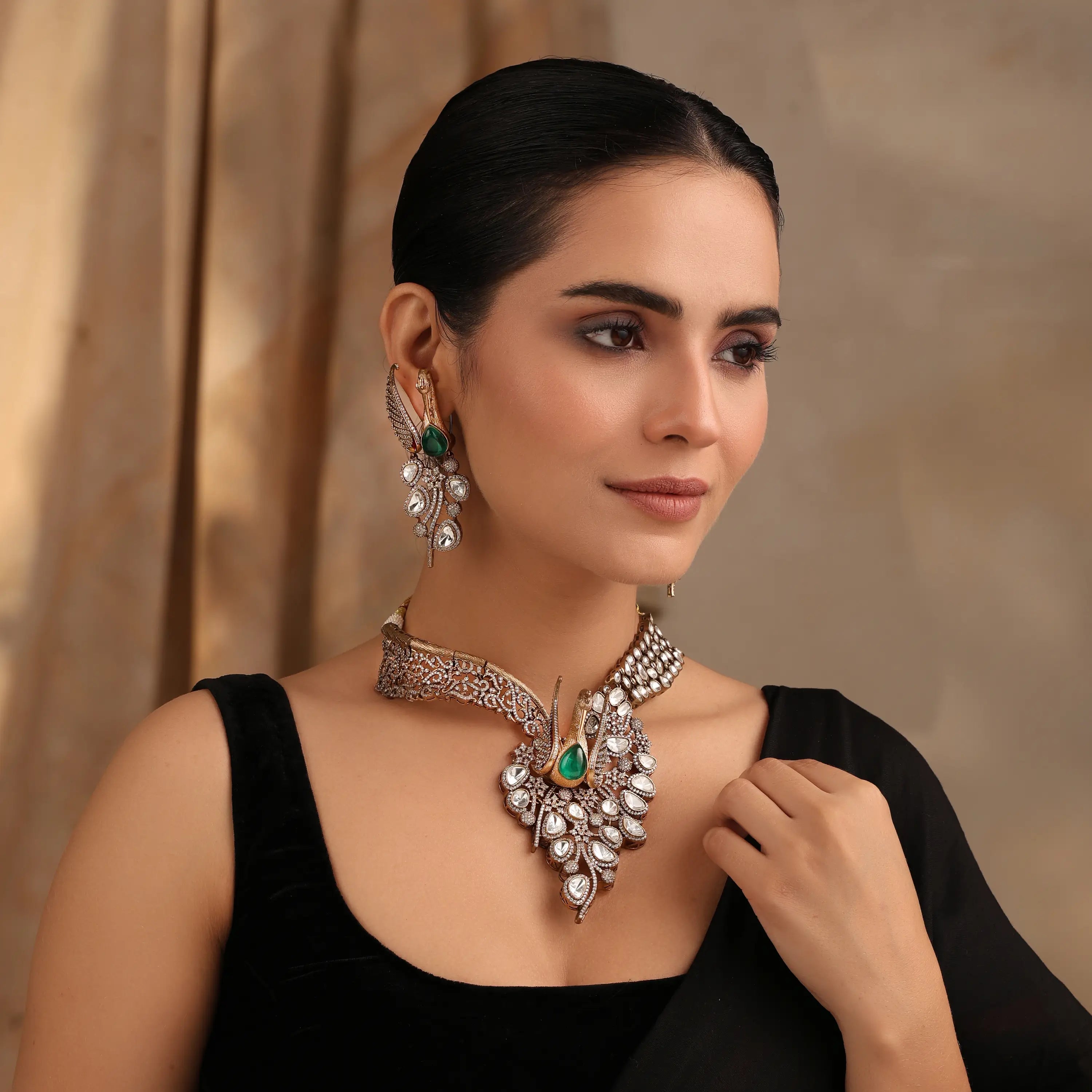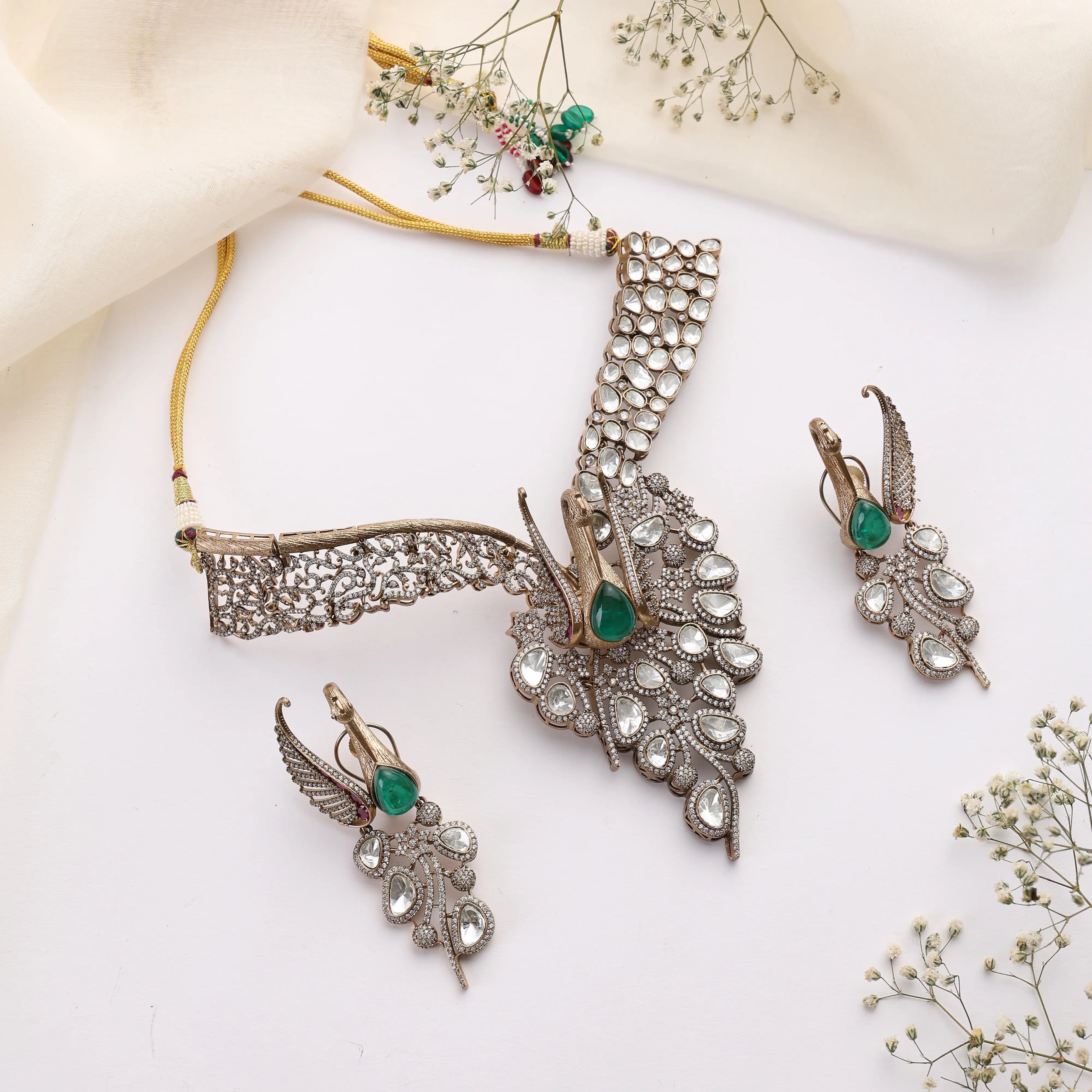 Emerald Peacock Kundan Choker Set (Necklace + Earrings)