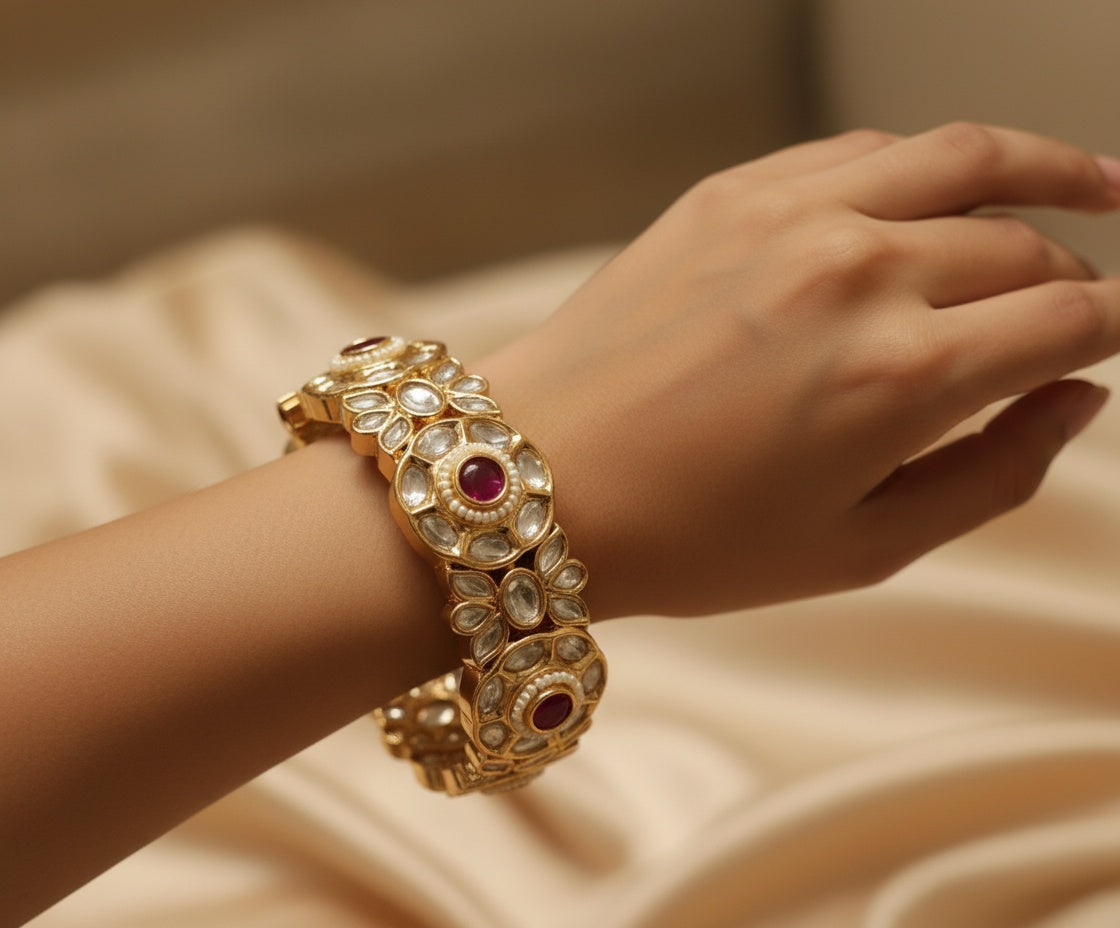 Our Ruby Polki Kada embodies timeless Indian craftsmanship with a royal touch. Designed to elevate your bridal or festive look, this kada is a heritage-inspired statement piece you’ll treasure for years.