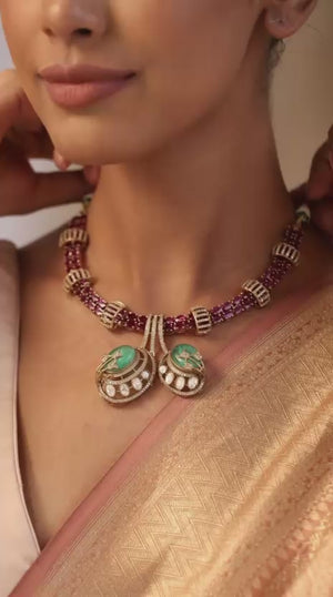 Bring timeless elegance to your collection with the Gulbahar Mint Ruby Polki Necklace Set. This handcrafted design features a striking contrast of rich ruby tones paired with soothing mint green stones, delicately detailed with floral motifs and sparkling polki accents. A statement piece perfect for weddings, festive occasions, and regal soirées.