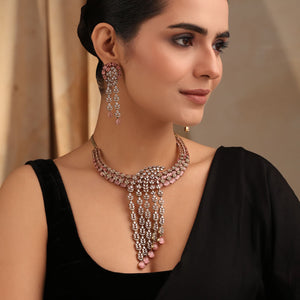 Delicate and graceful, the Gulnaar Blush Set is designed for the modern woman who loves timeless elegance. Featuring layers of blush pink stones and shimmering CZ diamonds, this necklace cascades like a waterfall of sparkle, beautifully complemented by long statement earrings.