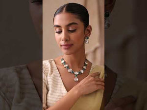 The necklace sits delicately along the neckline, creating a flattering silhouette, while the matching earrings add just the right touch of sparkle. Perfect for weddings, festive gatherings, or elegant evenings, Harita transitions effortlessly from day to night.