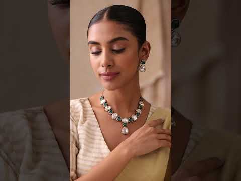 Introducing Harita — a refined emerald kundan necklace set inspired by graceful simplicity and timeless beauty. Designed for women who prefer understated elegance, Harita blends rich emerald-green stones with luminous kundan detailing for a look that feels both classic and contemporary.