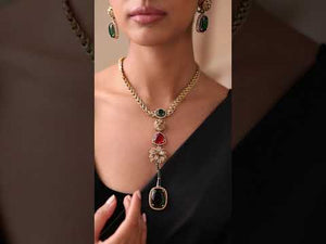 Inspired by Kareena’s iconic tropical jewelry looks, this Jaguar Long Necklace Set is a breathtaking fusion of bold elegance and artistic craftsmanship. The statement drop pendant features a striking mix of green and red stones, paired with a curved gold-plated chain that sits beautifully along the neckline. The matching earrings complete the look with regal jaguar studs finished with deep purple stones for a luxurious touch.