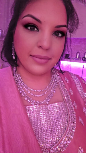- **Three Layers:** The necklace is designed with three layers of delicate chains or strands, which may vary in length for a cascading, layered effect. The layers can be made of metal like sterling silver, gold, or rose gold, and each layer may feature sparkling **Cubic Zirconia (CZ) stones** strategically placed for a glamorous appearance.