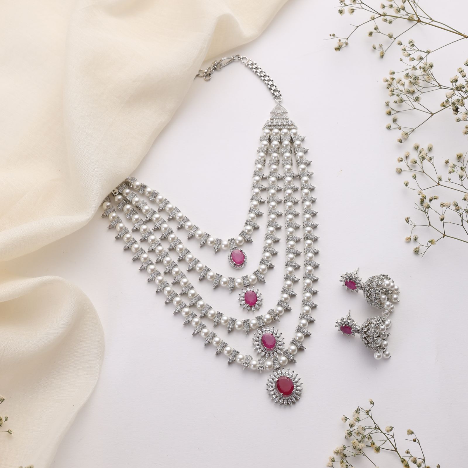This statement piece features five cascading layers of luminous pearls, accentuated with radiant ruby centerpieces and sparkling polki-inspired detailing. Paired with exquisite jhumka earrings, this set is designed for brides, festive occasions, and timeless celebrations.