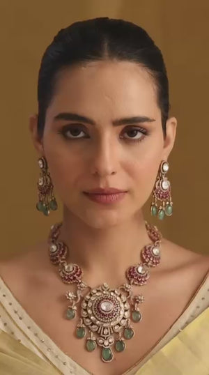 Turn heads at your next celebration with the Malika Long Kundan Moissanite Set, a statement piece inspired by timeless Indian heritage. This exquisite gold-plated jewelry set features intricate Kundan craftsmanship adorned with sparkling moissanite stones in elegant red and mint tones.