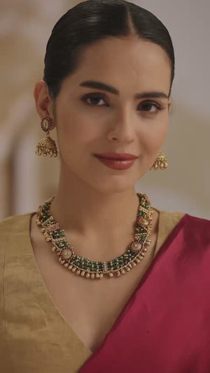 Elevate your traditional look with the Mehak Antique Green Necklace Set, a timeless blend of elegance and heritage. This handcrafted beauty features deep green beads intricately woven with antique gold plating, embellished with delicate floral motifs in pink and white stones for a luxurious finish.