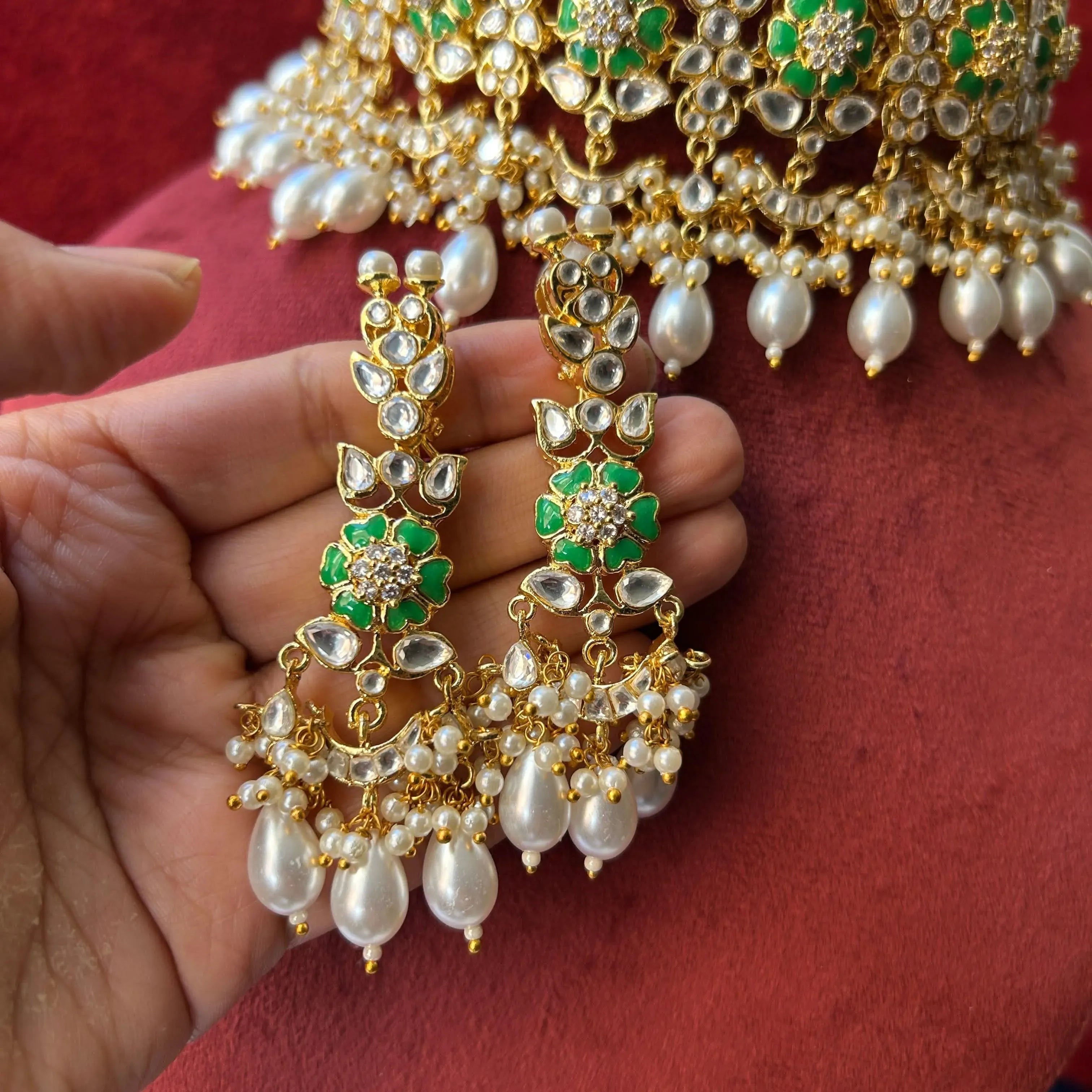 Gorgeous and elegant 24 K gold plated Mint Meenakari Kundan and CZ necklace set with dangling earrings