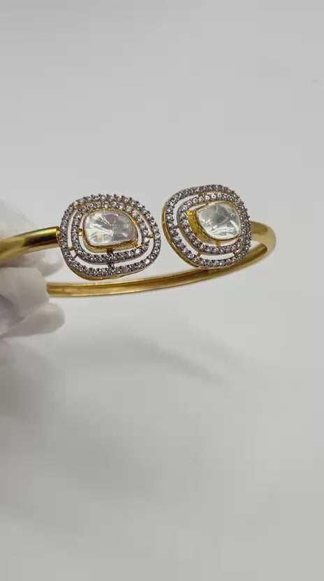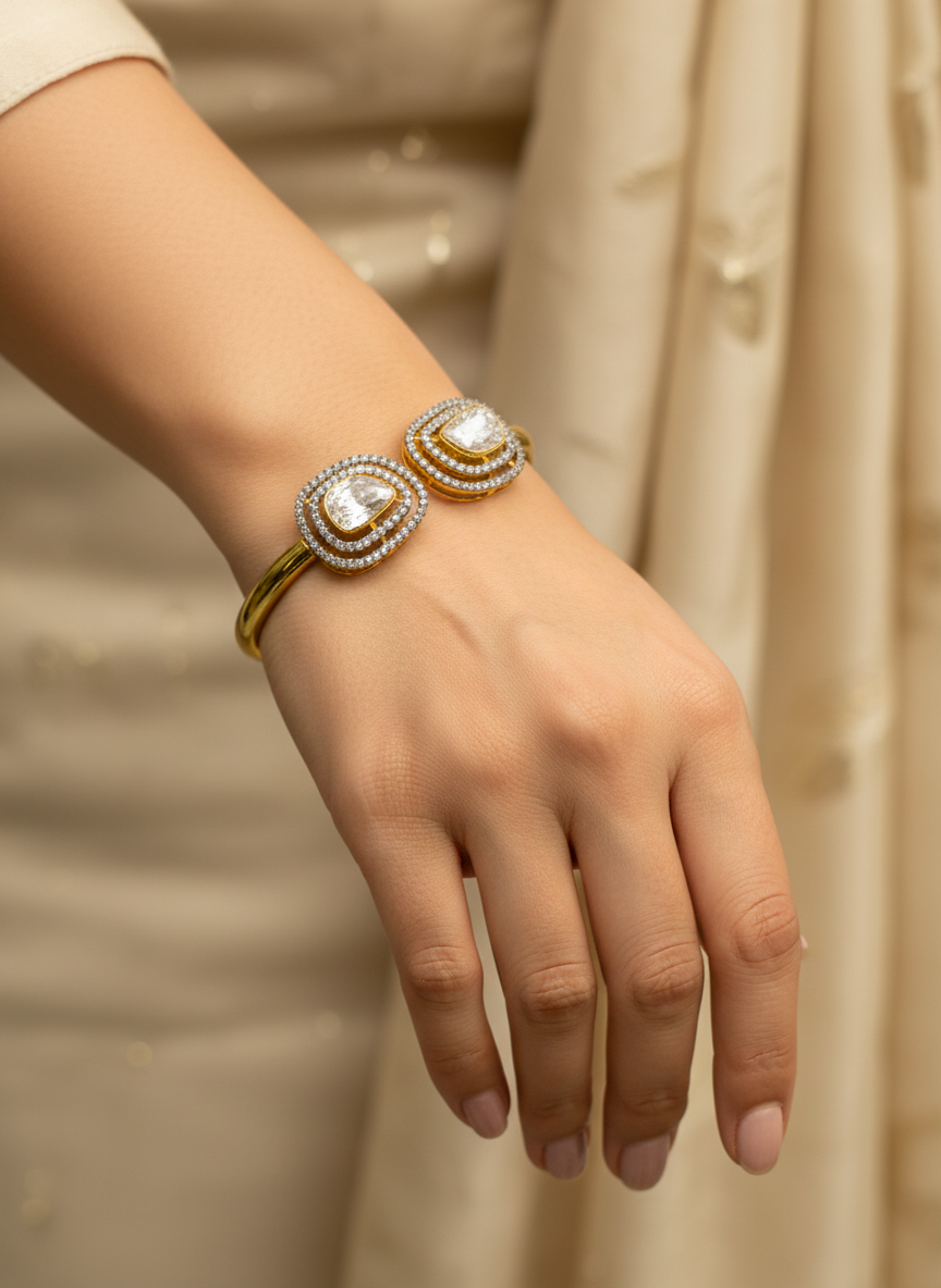 This stunning Kundan Uncut Polki CZ Cuff Bracelet is a true statement of timeless elegance. Featuring intricate Kundan work and sparkling CZ stones in a flexible cuff design, this bracelet adds a touch of luxury to any look — whether Indian or Western.