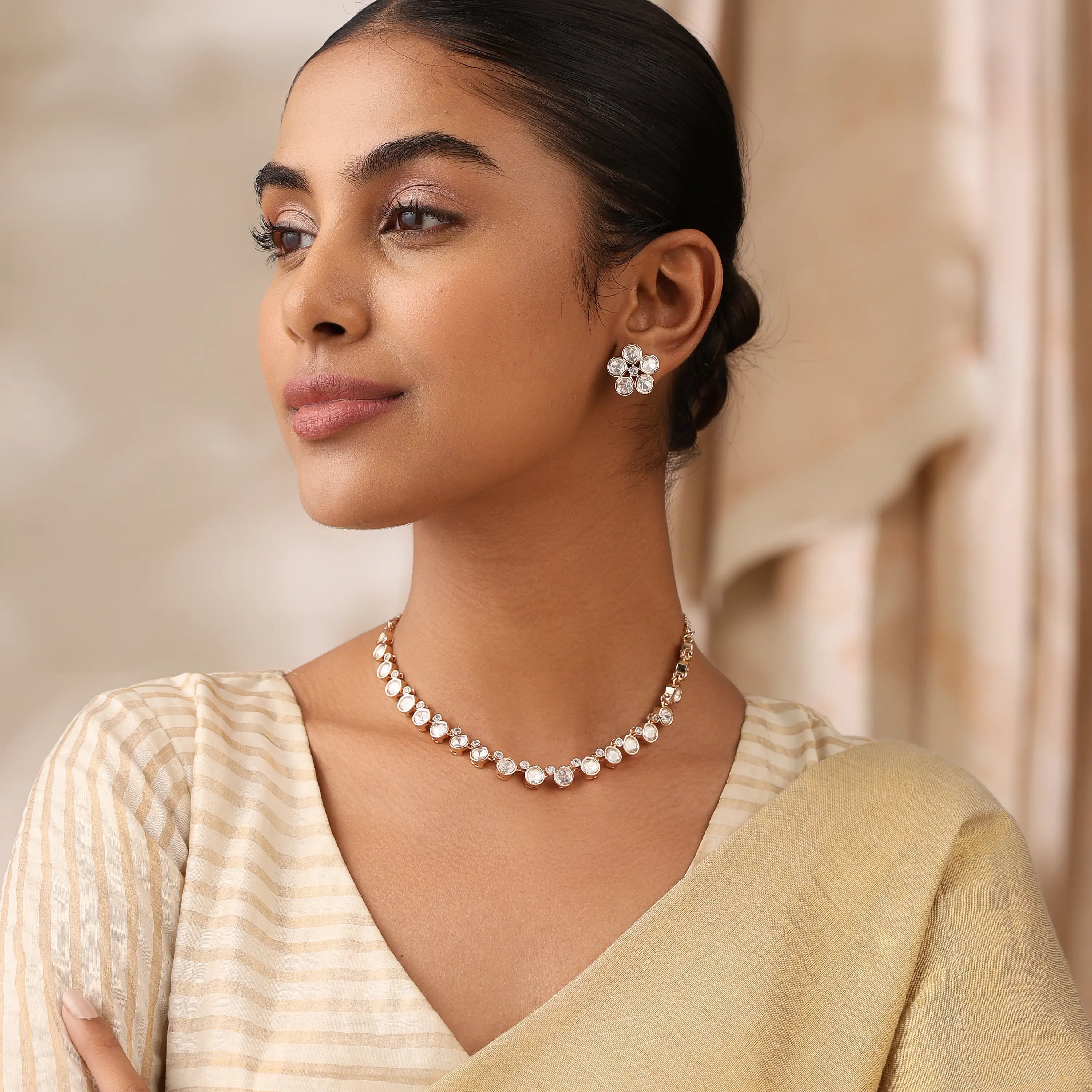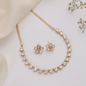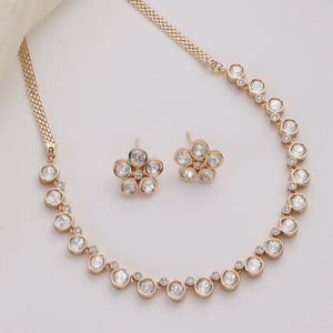 The warm gold-tone finish combined with the soft shimmer of the stones makes this necklace set ideal for festive wear, intimate gatherings, weddings, parties, or even elegant everyday styling. Its lightweight and minimal design ensures comfort while adding just the right amount of sparkle.