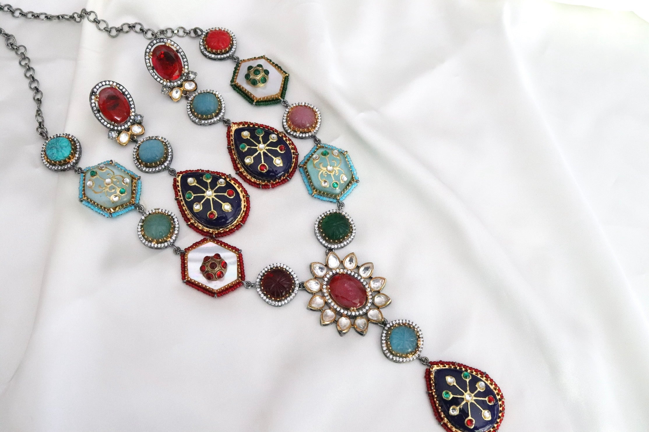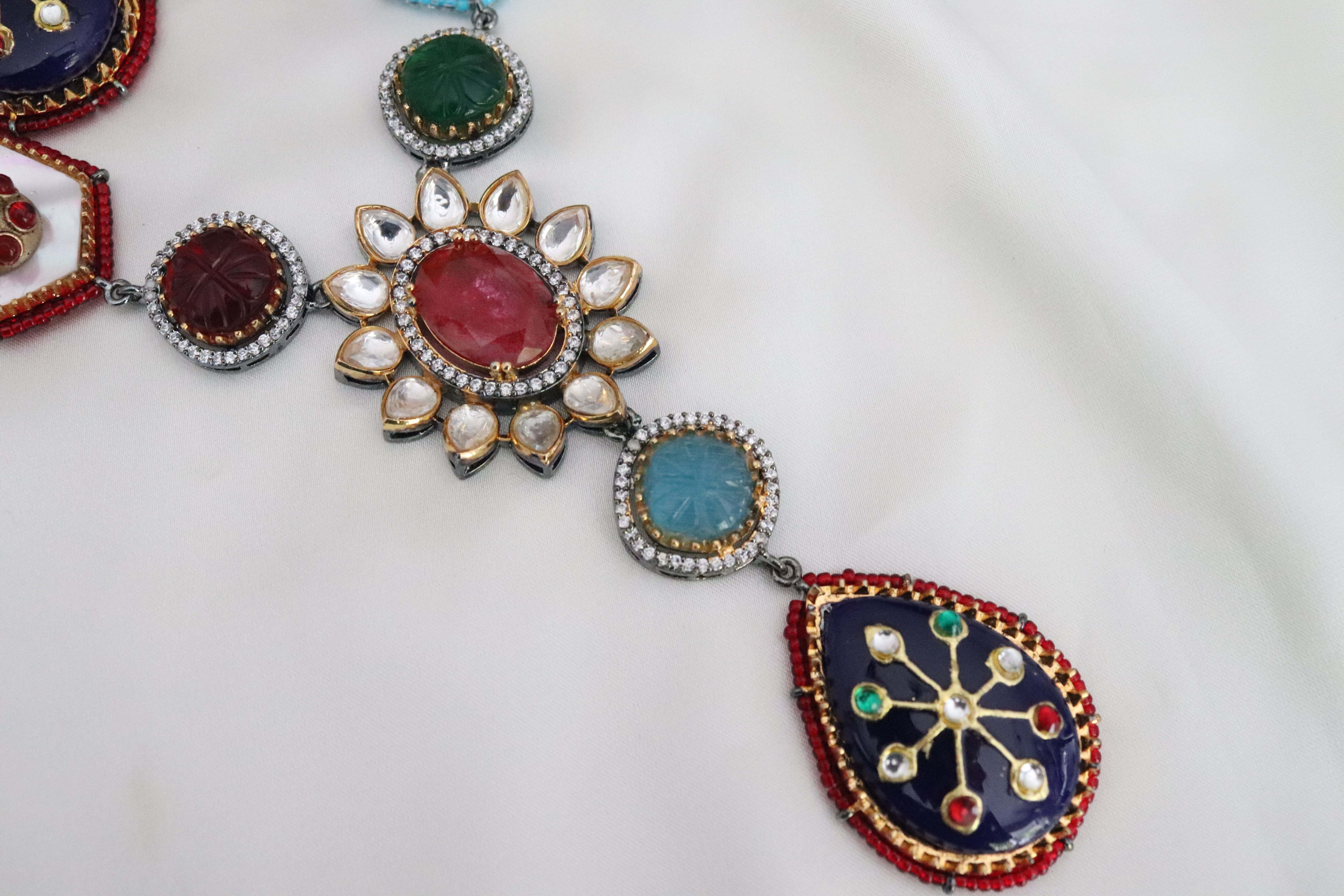 Turn heads with this exquisite multicolor statement necklace set, crafted with vibrant stones, intricate enamel detailing, and heritage-inspired artistry. A perfect blend of tradition and modern elegance, this designer set is made to elevate festive, bridal, and special occasion looks.
