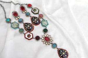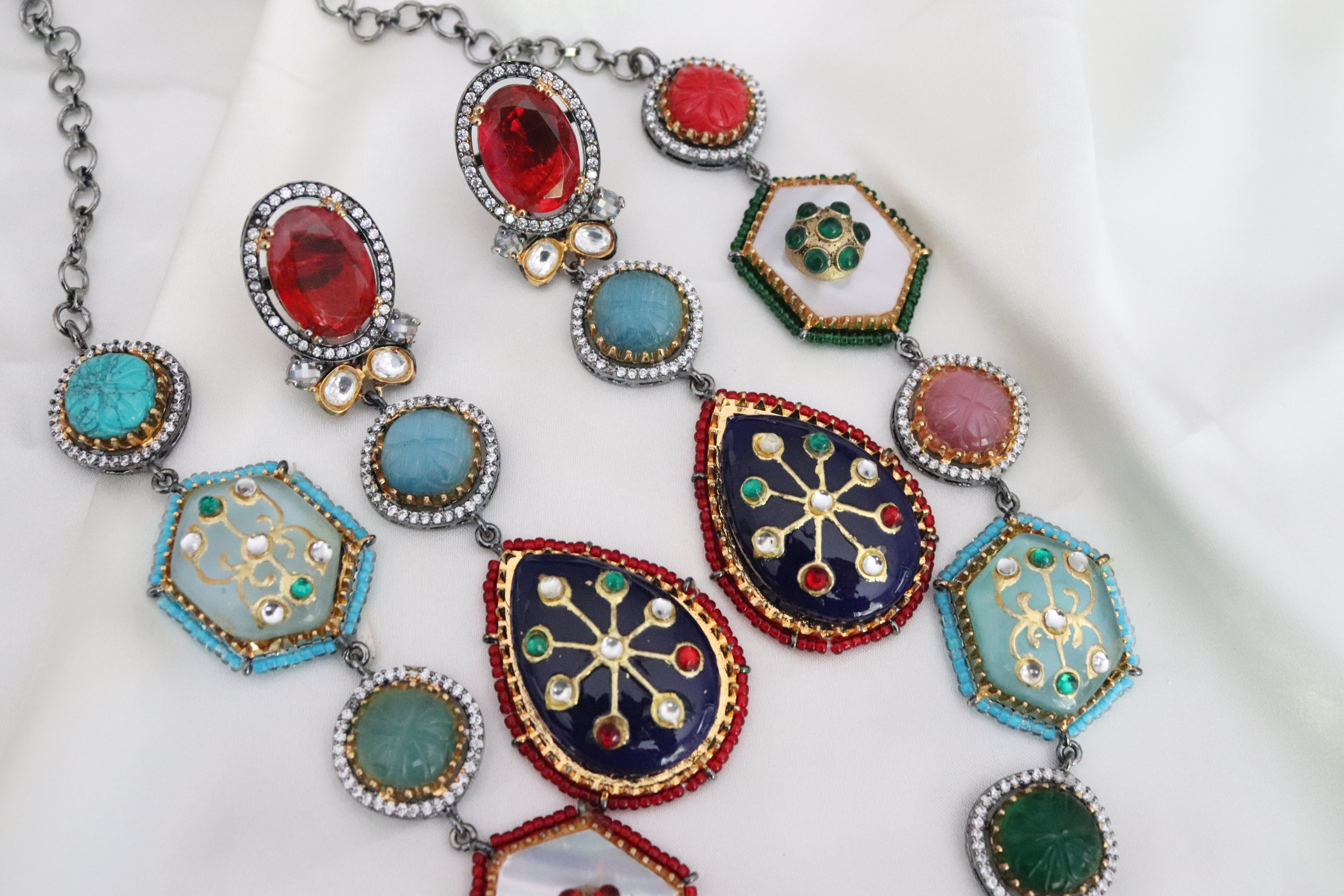 Multicolor Enamel & Stone Statement Necklace Set with Earrings