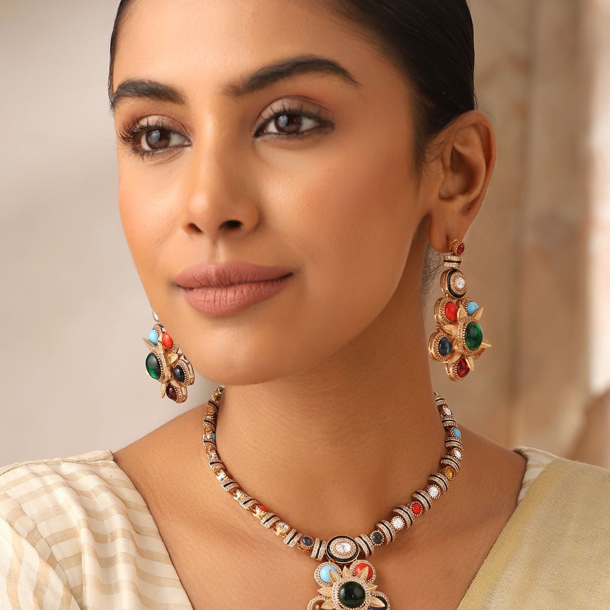 Add a burst of festive charm to your look with our Navrang necklace set. Designed with vibrant enamel detailing in shades of red, blue, yellow, and green, this exquisite piece is accentuated with a bold green centerpiece and matching earrings. Crafted with Kundan and fine CZ stones, it’s the perfect statement set for weddings, festivals, and celebrations.