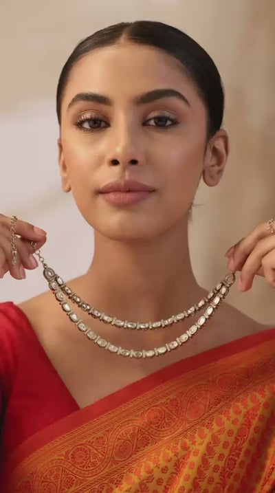 Our Nayab Necklace Set is the epitome of timeless elegance, crafted with uncut kundan polki stones set in a classic double-layered design. The choker-style necklace paired with matching statement earrings makes this set a perfect choice for weddings, festive occasions, and traditional celebrations.