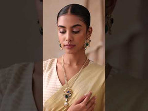 Graceful, regal, and timeless — the Neelima Emerald Pendant Set is a celebration of refined craftsmanship and modern elegance. Featuring rich emerald-green stones paired with luminous polki-inspired detailing, this pendant set is designed to elevate both traditional and contemporary looks.