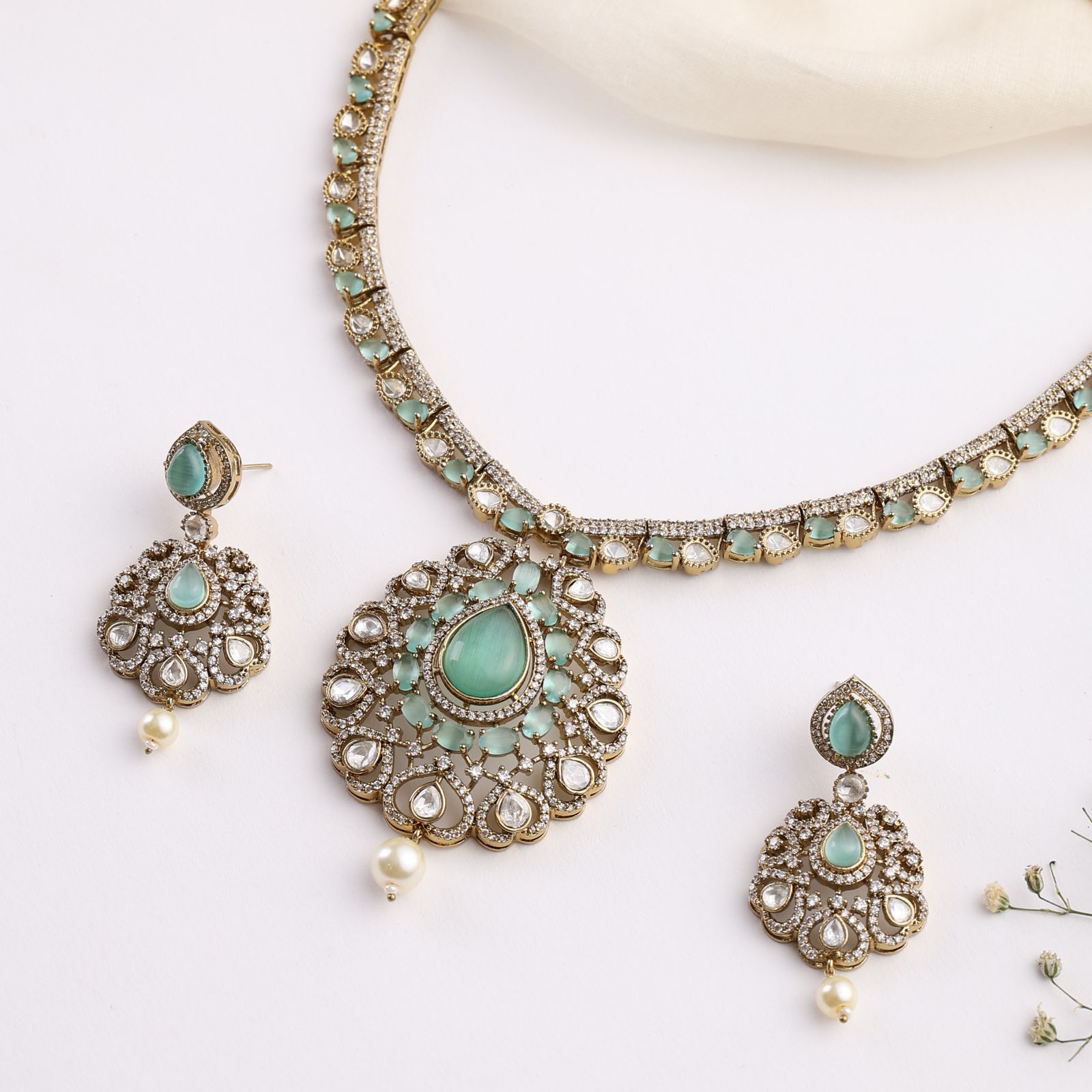 Nivara Mint Green Polki Kundan Necklace Set (With Earrings)