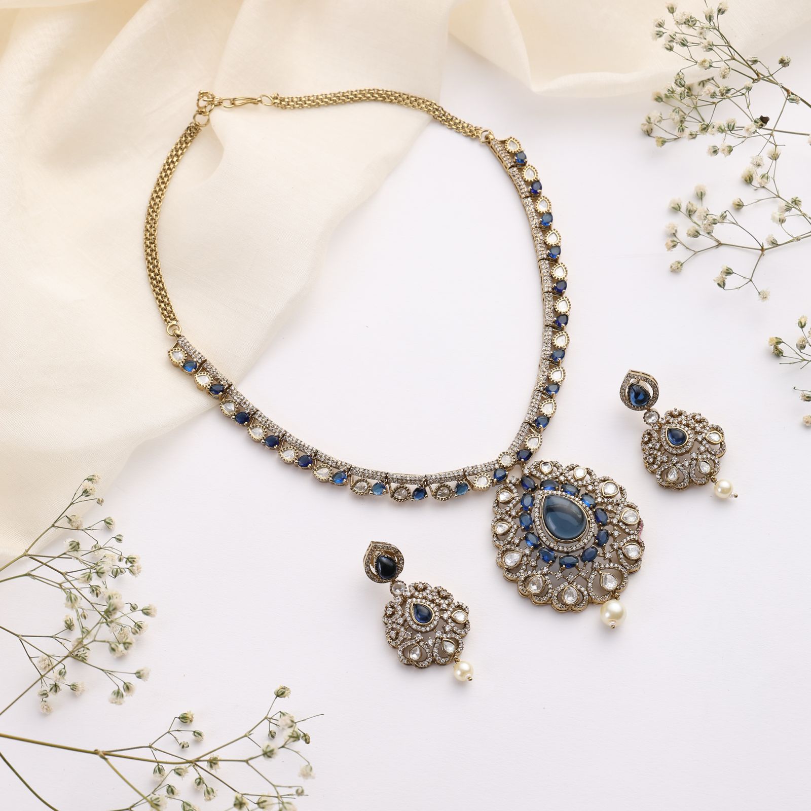 Nivara Blue Polki Kundan Necklace Set (With Earrings)