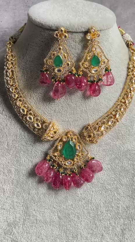 Niza Ruby Green Necklace Set with Earrings – Polki, Emerald & Ruby Beads