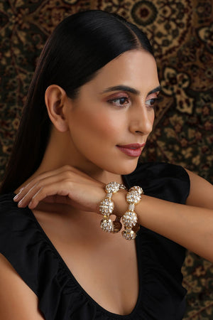 openable. Sold as pair onlyExude royal charm with these handcrafted heritage bangles, featuring intricate antique gold work and dual rows of kundan stones. Their bold yet elegant design makes them the perfect statement accessory for festive occasions, weddings, or cultural gatherings.
