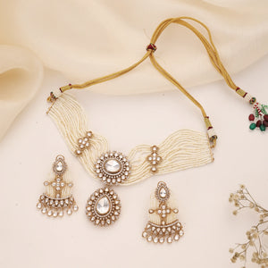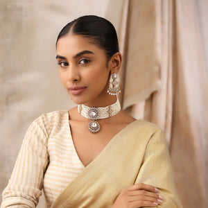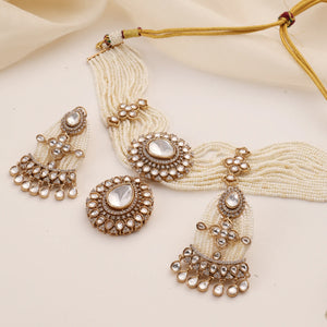 Refined and timeless, this pearl choker necklace set features delicate layered pearls paired with polki-style stones in a rich gold finish. Designed to sit beautifully on the neckline, this set includes a statement choker and matching earrings for a complete, polished look.