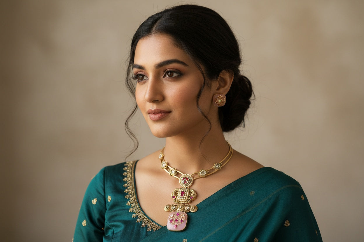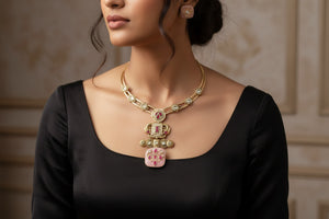 Add a touch of regal charm with this Pink Enamel Kundan Necklace Set, handcrafted with exquisite detailing in ruby, kundan, and pearl accents. Designed with antique-inspired motifs, this piece is perfect for weddings, festive occasions, and elegant soirées.