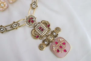 Pink Enamel Kundan Necklace Set with Ruby Accents & Matching Earrings