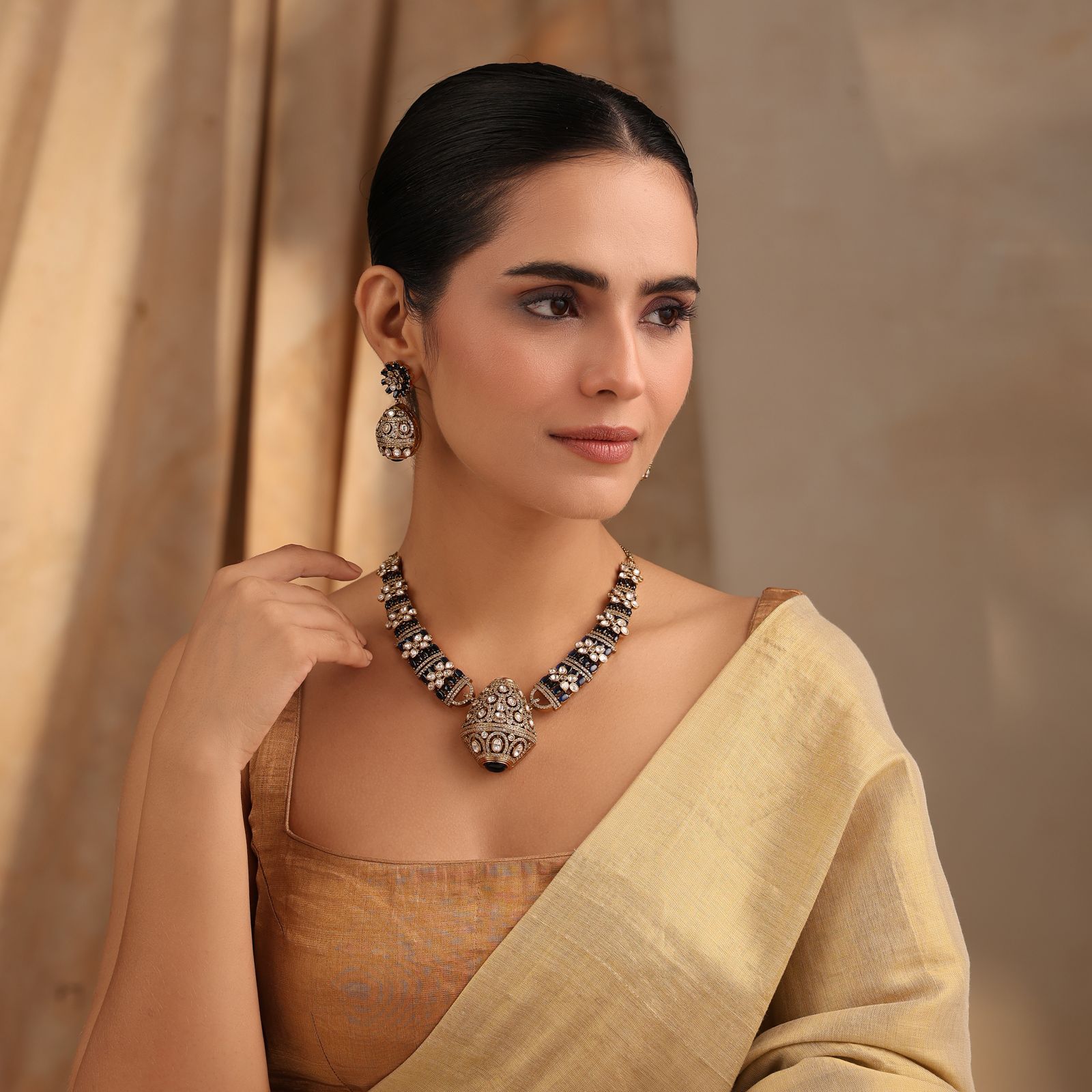 Let the necklace take center stage—pair with a silk sari or embellished lehenga. Finish with soft waves or a sleek bun to spotlight the neckline.