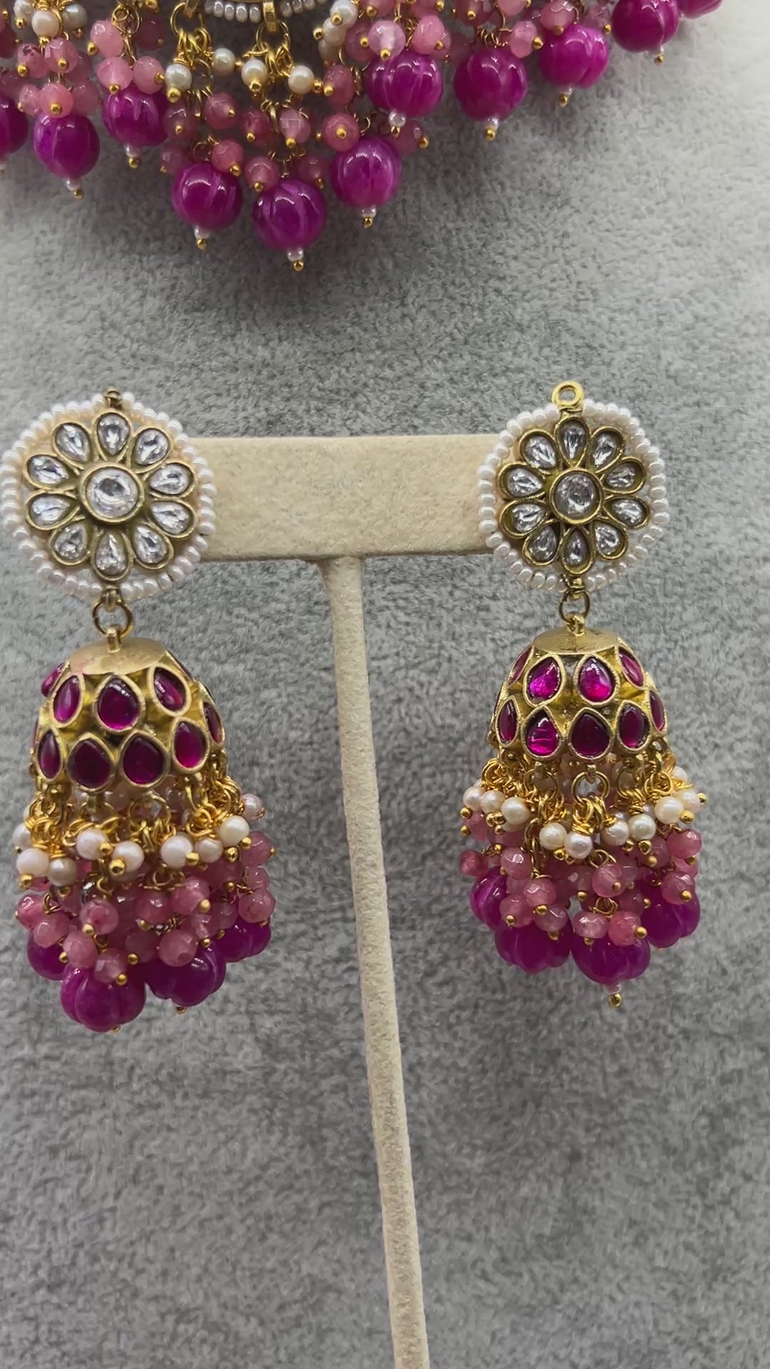 Rani Pink Jadau Kundan choker set with Jhumka earrings in antique gold plating