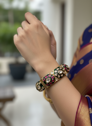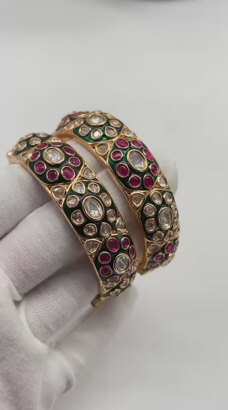 Bring timeless elegance to your collection with these Ruby Green Mossonite Bangles. Designed with intricate floral motifs, each bangle is adorned with uncut polki stones set in an antique gold polish, exuding regal charm and heritage craftsmanship. Perfect for weddings, festive occasions, or heirloom gifting.