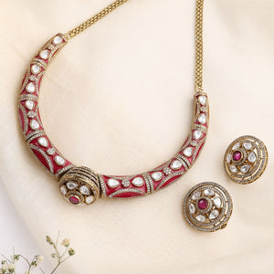 Rudra Rani Pink Kundan Hasli Set in Antique Finish with Earrings