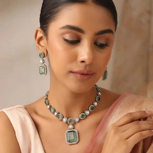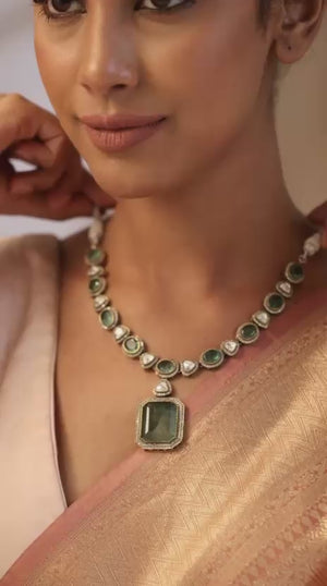 Fresh, luminous and timeless—this statement set pairs jelly-mint/sage green stones with hand-set uncut polki and pavé halos. The necklace sits beautifully on the collarbone while the matching drops frame the face for effortless occasion sparkle.