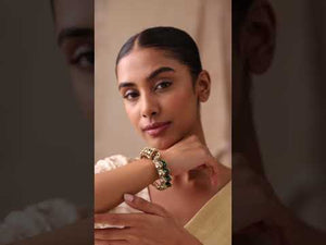 Sitara Emerald Polki Openable Kada Bracelet is a radiant statement piece inspired by timeless Indian artistry. Crafted in a rich gold-plated finish, this kada features luminous uncut polki stones paired with deep emerald-green accents for a regal, festive look.