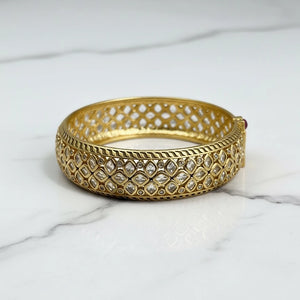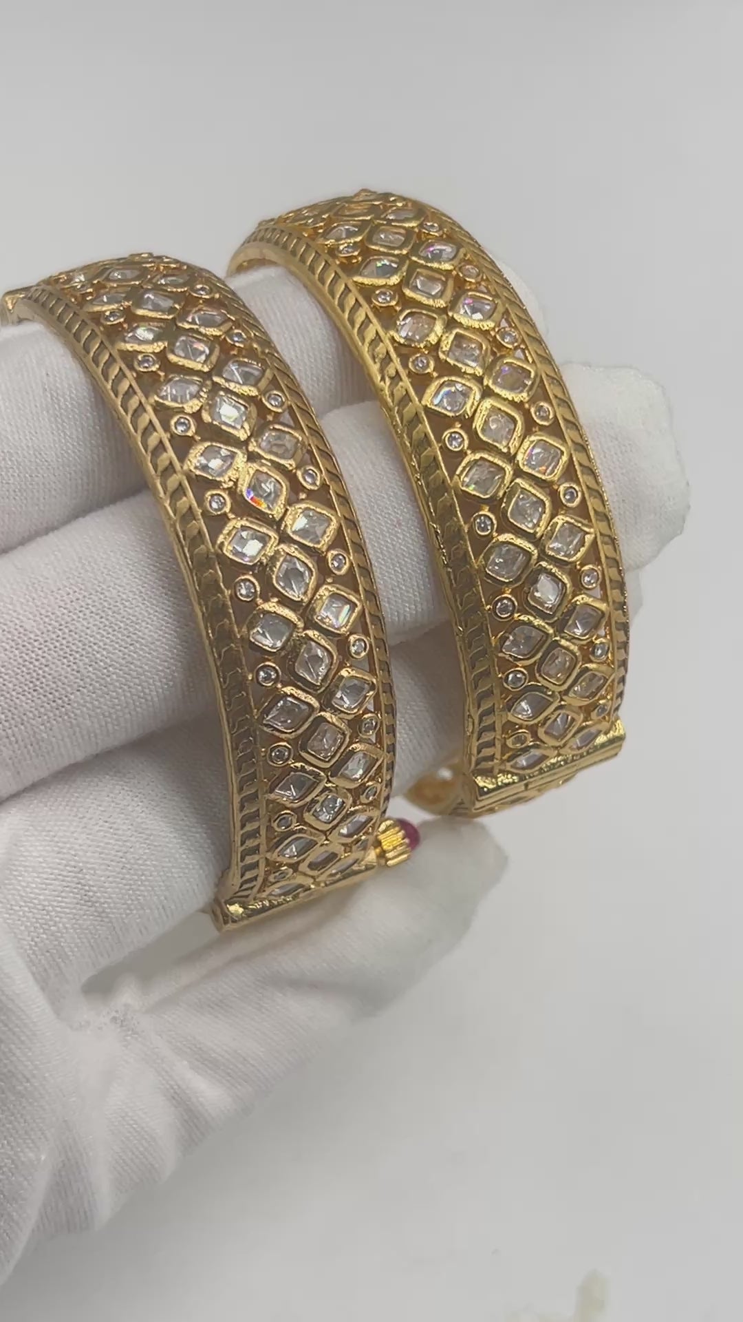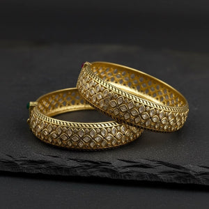 Elevate your traditional look with these exquisite openable bangles, crafted in an antique gold finish. Featuring uncut Polki stones, these bangles are a timeless blend of heritage and elegance. Perfect for weddings, festive occasions, and grand celebrations.