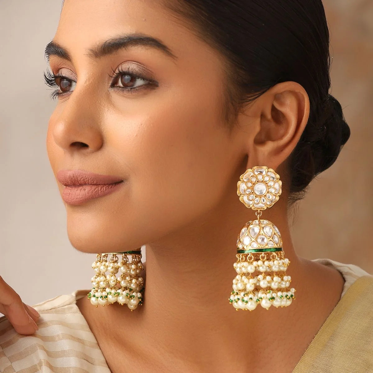 Design: Traditional uncut polki jhumka earrings with layered pearl hangings and subtle green detailing.