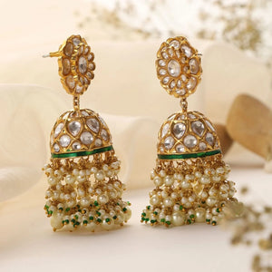 Uncut Polki Pearl Jhumka Earrings with Green Accents